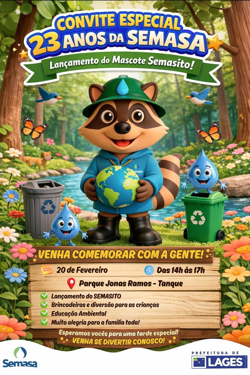 Muitas atividades e ações de conscientização estão sendo preparadas pela equipe da Semasa, entre elas: brincadeiras, educação ambiental, pintura facial, distribuição de pipoca e algodão doce e a apresentação da mascote Semasito, um simpático guaxinim especialista em manter tudo limpo e organizado. “O Semasito passa a fazer parte na equipe da Semasa com o intuito de levar muita informação e educação ambiental para crianças e adultos. Dentro do programa Recicla + Lages, seguimos trabalhando para que a nossa cidade torne-se um modelo a ser seguido de reciclagem, destinação correta de resíduos e contra o desperdício”, explica a diretora-presidente da autarquia, Paula Cristina Granzzoto.